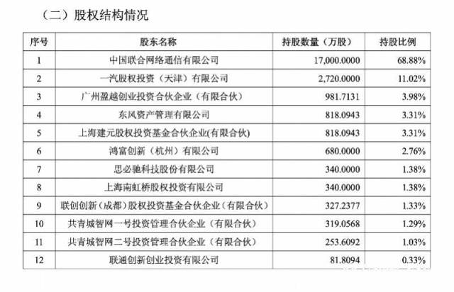 此次公告显示,中国联合网络通信有限公司占智网科技68.88%的股份,此外如一汽股权投资(天津)有限公司、广州盈越创业投资合伙企业(有限合伙)、东风资产管理有限公司、上海建元股权投资基金合伙企业(有限合伙) 、鸿富创新(杭州)有限公司、思必驰科技股份有限公司、上海南虹桥股权投资有限公司、联创创新 (成都) 股权投资基金合伙企业 (有限合伙)、共青城智网一号投资管理合伙企业(有限合伙)、共青城智网二号投资管理合伙企业(有限合伙)等头部公司也是智网科技的股东。