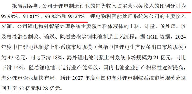 理奇智能的产品高度集中在锂电制造行业。报告期各期,公司在锂电制造行业的销售收入占主营业务收入的比例分别为95.98%、91.81%、93.82%和90.24%。