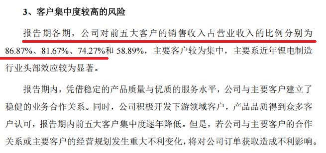 与此同时,客户集中度也极高。报告期各期,公司对前五大客户的销售收入占营业收入的比例分别为86.87%、81.67%和74.27%。