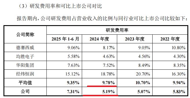 面对现场检查,埃泰克的研发费用率成为市场关注焦点。2024年,公司研发费用率为5.19%,而同期同行业可比公司平均值为9.78%。