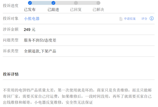 一般而言,重营销,轻研发会往往会导致品牌研发实力的薄弱与产品质量的下滑。在低价获客的同时,小熊电器产品也承受了不少差评及投诉压力。经《投资者网》查阅并统计国内多个投诉平台,比如在黑猫投诉上,涉及小熊电器的产品投诉多达47条,已回复信息达45条,已完成的条数仅有30条。除此之外,在21CN聚投诉以及315消费保等多个投诉平台上均出现多条用户对小熊电器的投诉反馈。