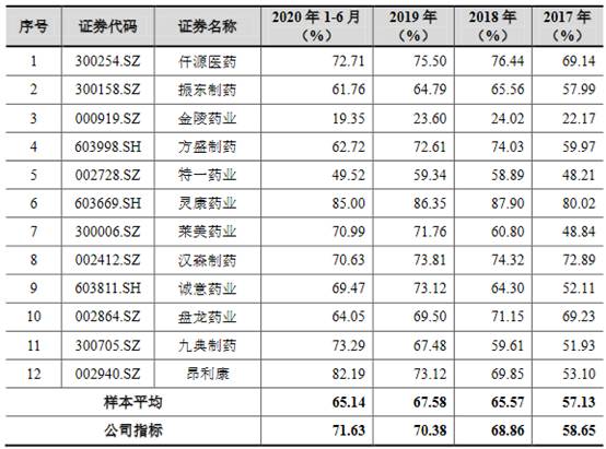 报告期内,华纳药厂主营业务毛利率略高于同行业可比公司平均水平,即57.13 %、65.57%、67.58%、65.14%。