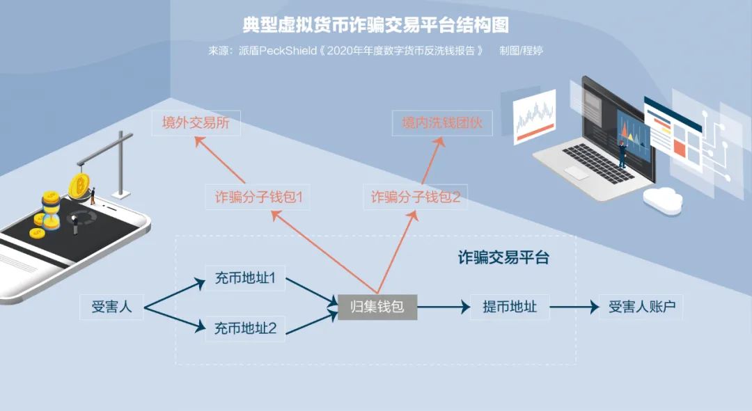 PeckShield告诉《中国新闻周刊》,2020年,因诈骗案件造成的损失共有31.3亿美元。这类案件往往以投资名义让受害人先到正规交易平台用现金购买虚拟货币,再诱骗对方将已买的虚拟货币转移至诈骗分子指定的虚假平台或地址。一旦转移,虚拟货币会迅速通过洗钱团伙处理或者流入境外交易所,为追回资金造成极大的难度。诈骗类安全事件已经成为区块链世界最大的安全威胁。