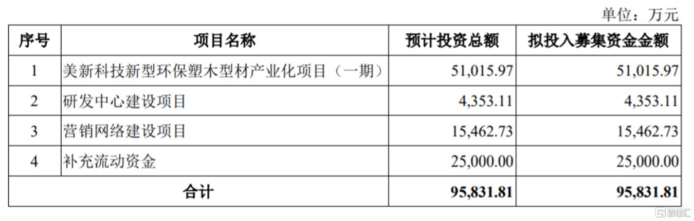 本次申请上市,美新科技拟募集资金约9.58亿元,用于美新科技新型环保塑木型材产业化项目(一期)、研发中心建设项目、营销网络建设项目、补充流动资金。