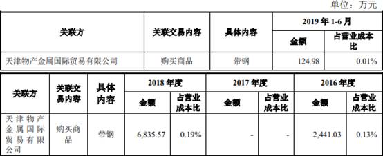 其中,2016年、2018年、2019年1-6月,友发集团向天津物产金属国际贸易有限公司采购带钢金额分别为2441.03万元、6835.57万元、124.98万元。