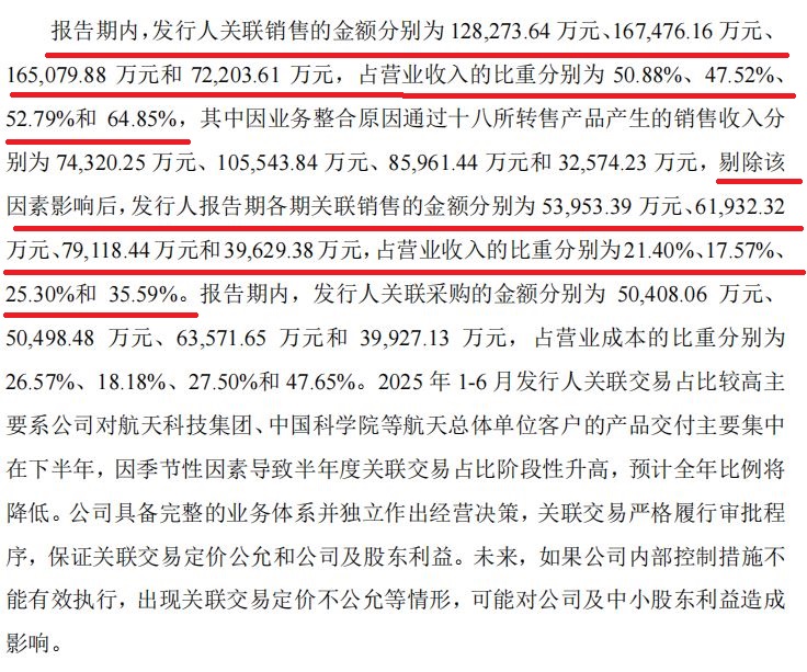 报告期内,公司关联销售的金额占营业收入的比重分别为50.88%、47.52%和52.79%,一度超过半数收入来自关联交易。剔除业务整合初期通过十八所的转售业务后,各期的关联销售比重仍分别达到21.40%、17.57%和25.30%。