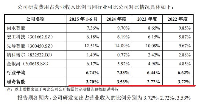 作为一家以技术创新为核心的企业,理奇智能的研发投入却明显低于同行。2022年至2024年,公司研发费用率分别为3.72%、2.72%和3.53%,而同行业可比公司均值分别为6.62%、6.44%和7.33%。
