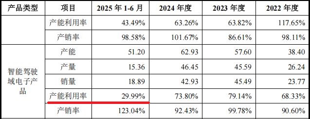 2025年上半年,埃泰克的智能驾驶域电子产品产能利用率仅为29.99%,不足三成;动力域电子产品产能利用率也仅为43.49%,不足五成。
