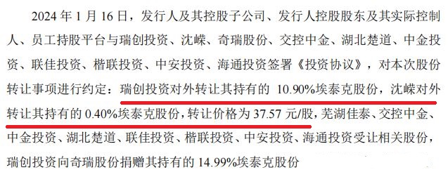奇瑞汽车不只是埃泰克最大的客户,也是其最大的股东之一。奇瑞汽车持有埃泰克14.99%股份,是外部投资者中的最大出资者。